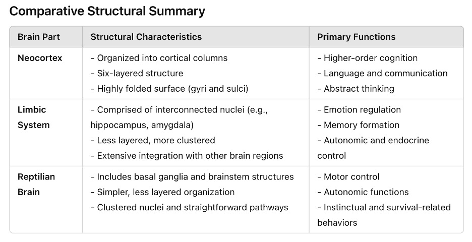 - Neocortex Complexity: The neocortex is not merely an add-on to older structures but interacts dynamically with them. Functions like emotions and memory are deeply integrated with higher-order cognitive processes, contrary to the compartmentalization suggested by the theory.