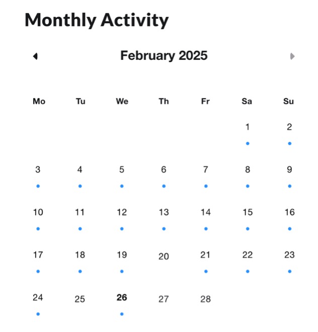 Three missed workout days this year so far. Exercise duration and calories burned trending up from last year!