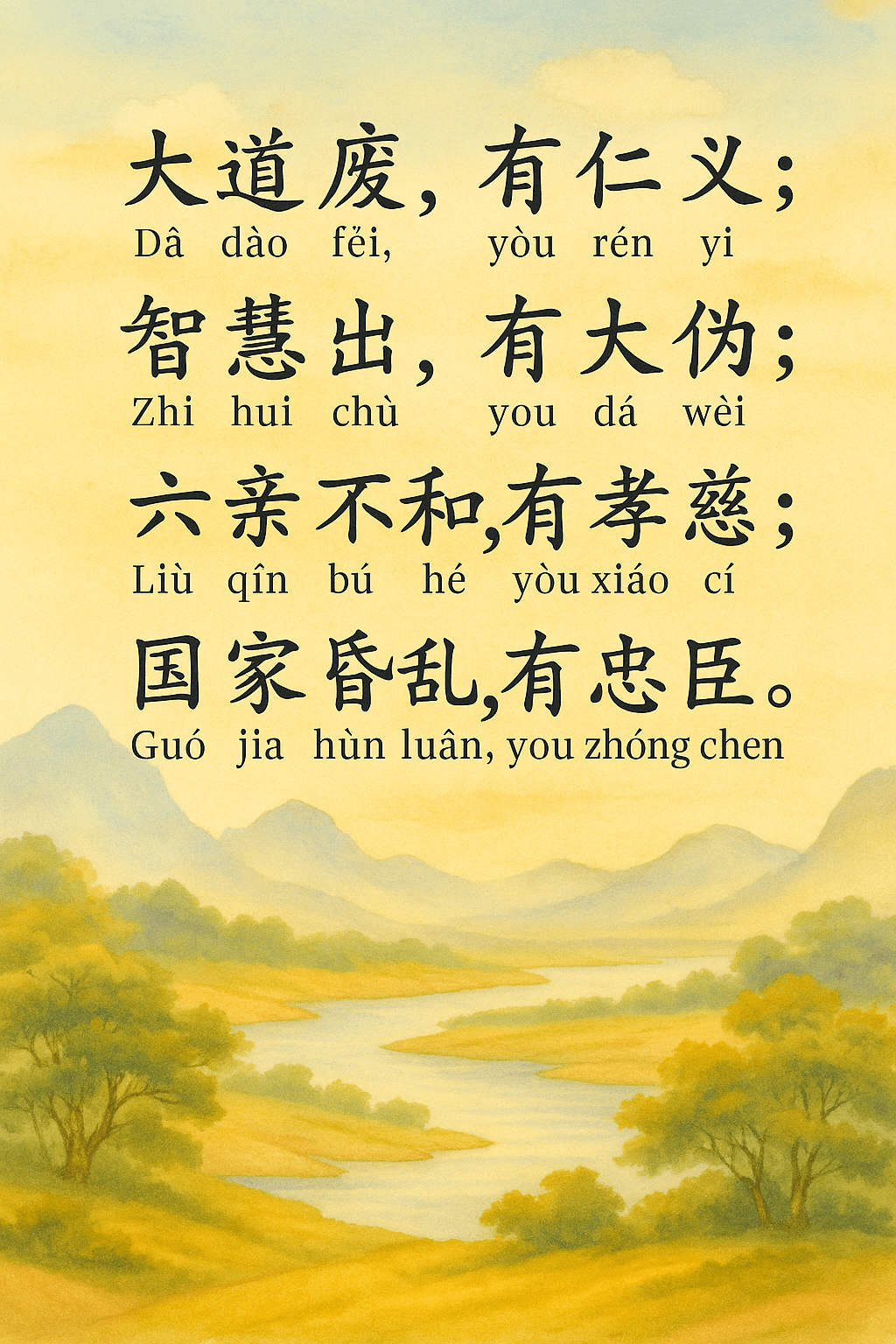 That’s the radical message Laozi delivers in Chapter 18 of the Dao De Jing. In this brief but powerful verse, he flips conventional morality on its head. Instead of celebrating righteousness, cleverness, and filial duty as virtues to aspire to, he treats them as symptoms of a world that has strayed from its natural path.